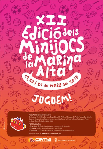 Juguem! ¡Juguemos! Dejemos de contemplar el dantesco espectáculo de la grada y pasémoslo bien. Probablemente ese es el mensaje que hoy más que nunca querrían gritar a los cuatro vientos los niños que, cada vez con mayor frecuencia, son testigos de lamentables peleas en las gradas durante sus competiciones deportivas. Y lo que es peor: protagonizadas por sus propios padres. Padre y madres que, lejos de disfrutar viendo cómo se divierten sus hijos, se dedican a arruinarles la fiesta. Y esa es justamente la proclama que hemos querido transmitir en el cartel de los XII Minijocs de la Marina Alta, diseñado en nuestro estudio para el CEMA (Consorci Esportiu de la Marina Alta).
